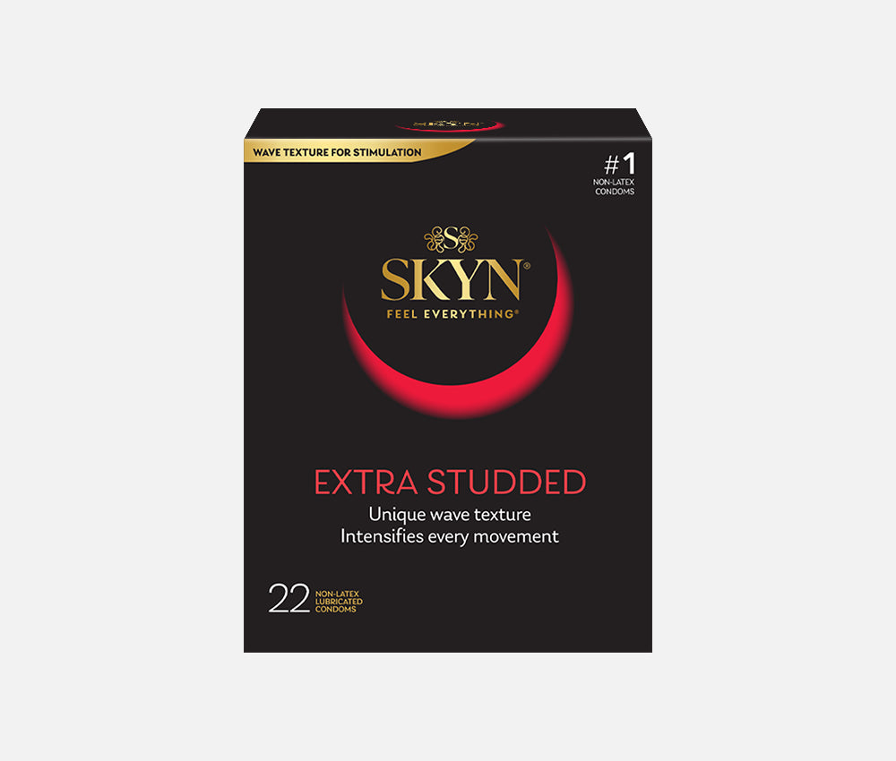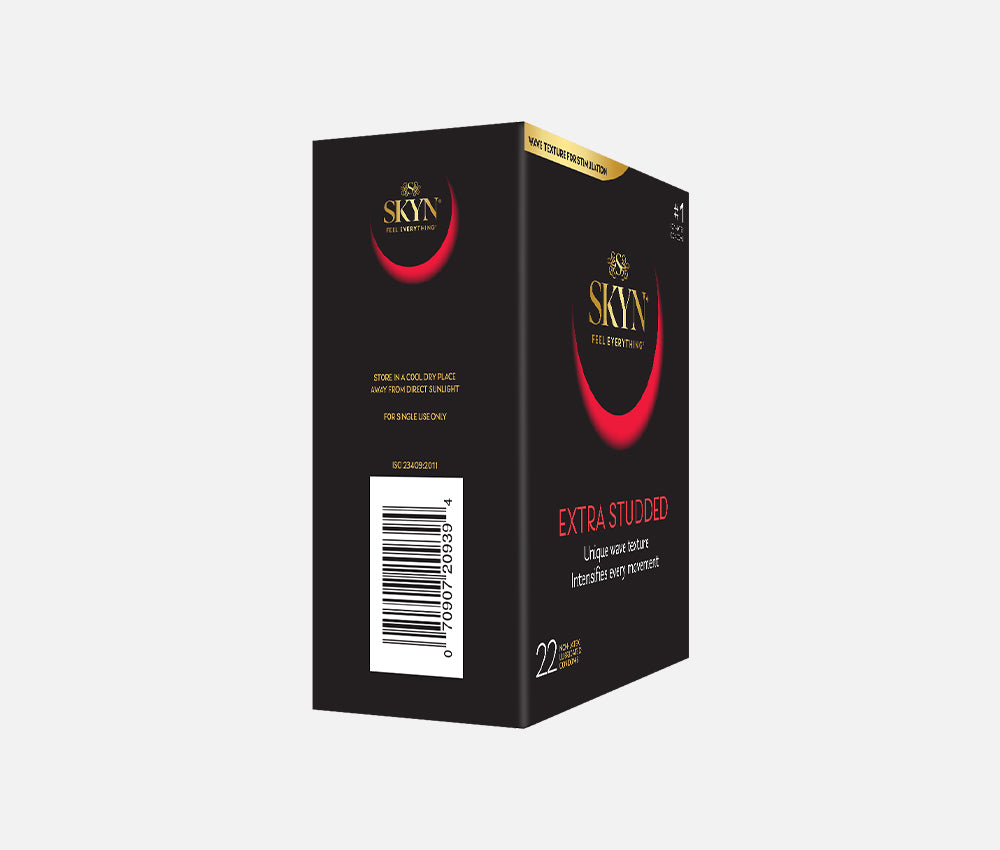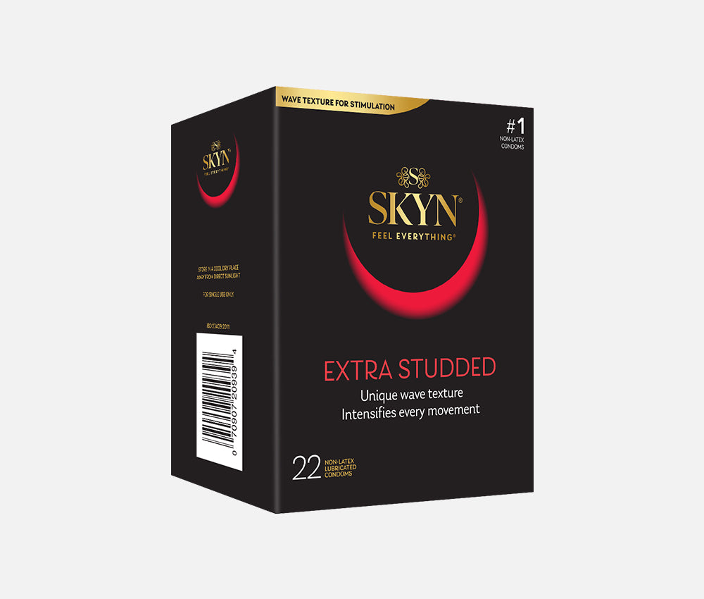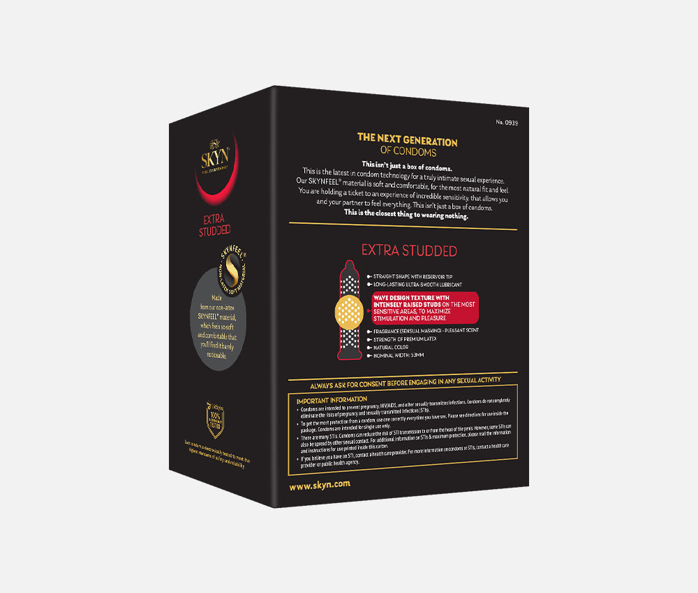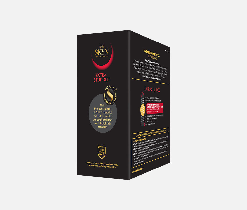 SKYN Extra Studded condoms feature a wave design texture with intensely raised studs on the most sensitive areas to maximize stimulation and pleasure. Made from our non-latex SKYNFEEL material, which feels so soft and comfortable that you'll find it barely noticeable.