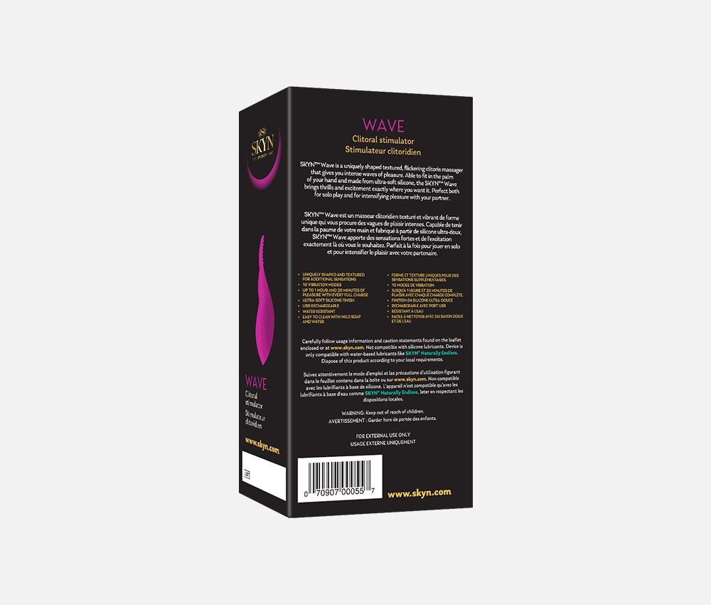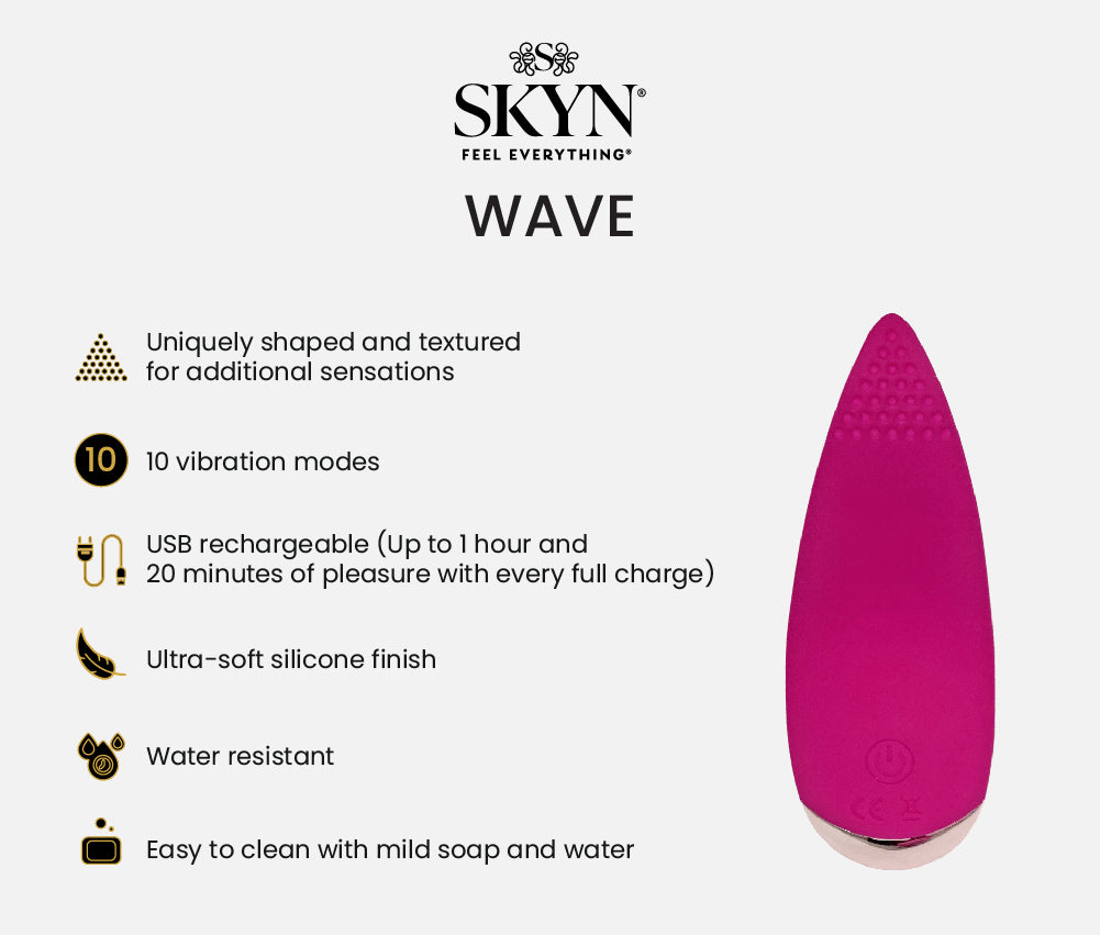 SKYN™ Wave is a uniquely shaped textured, flickering clitoris massager that gives you intense waves of pleasure. Able to fit in the palm of your hand and made from ultra-soft silicone, the SKYN™ Wave brings thrills and excitement exactly where you want it. Perfect both for solo play and for intensifying pleasure with your partner.